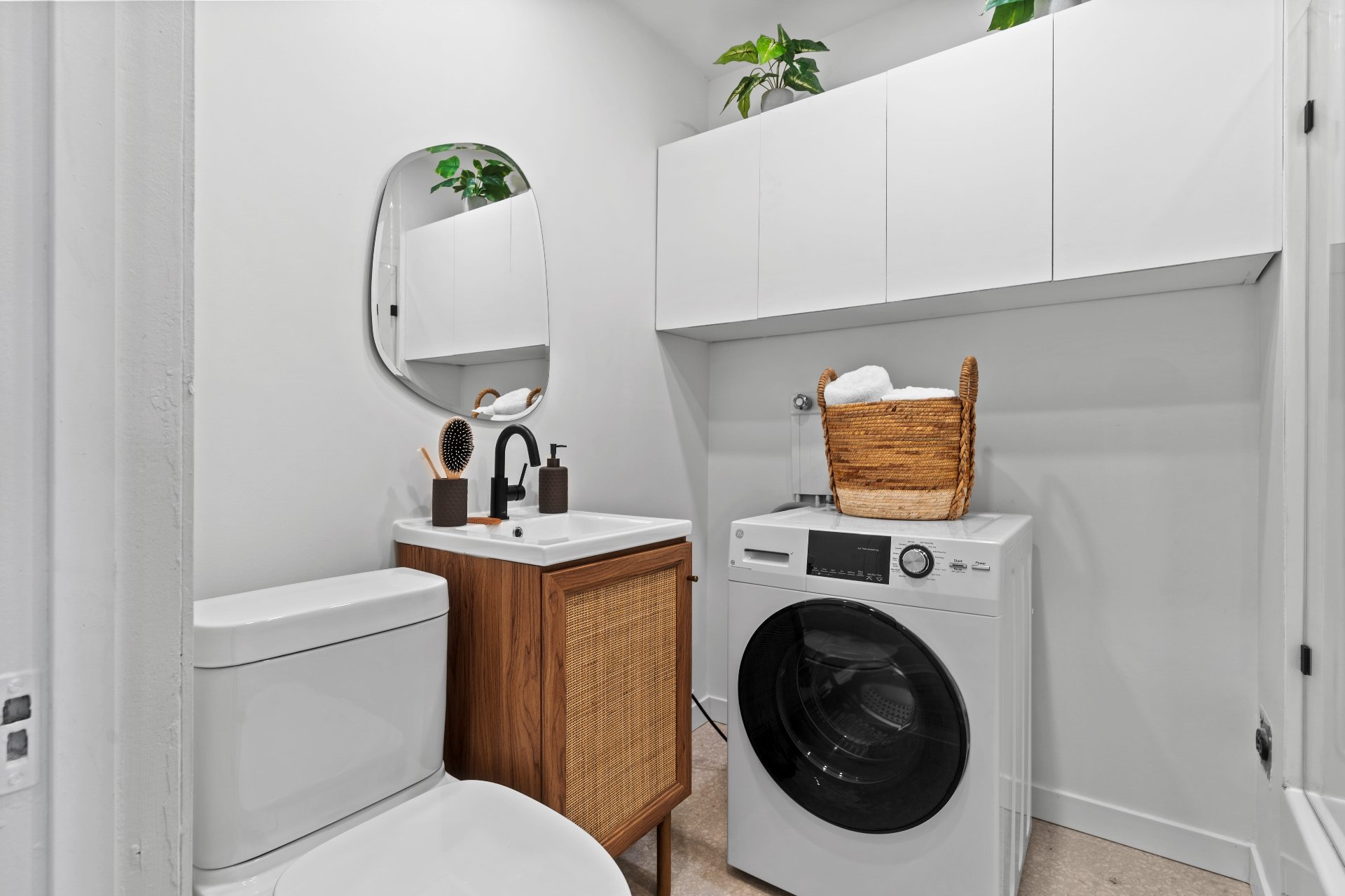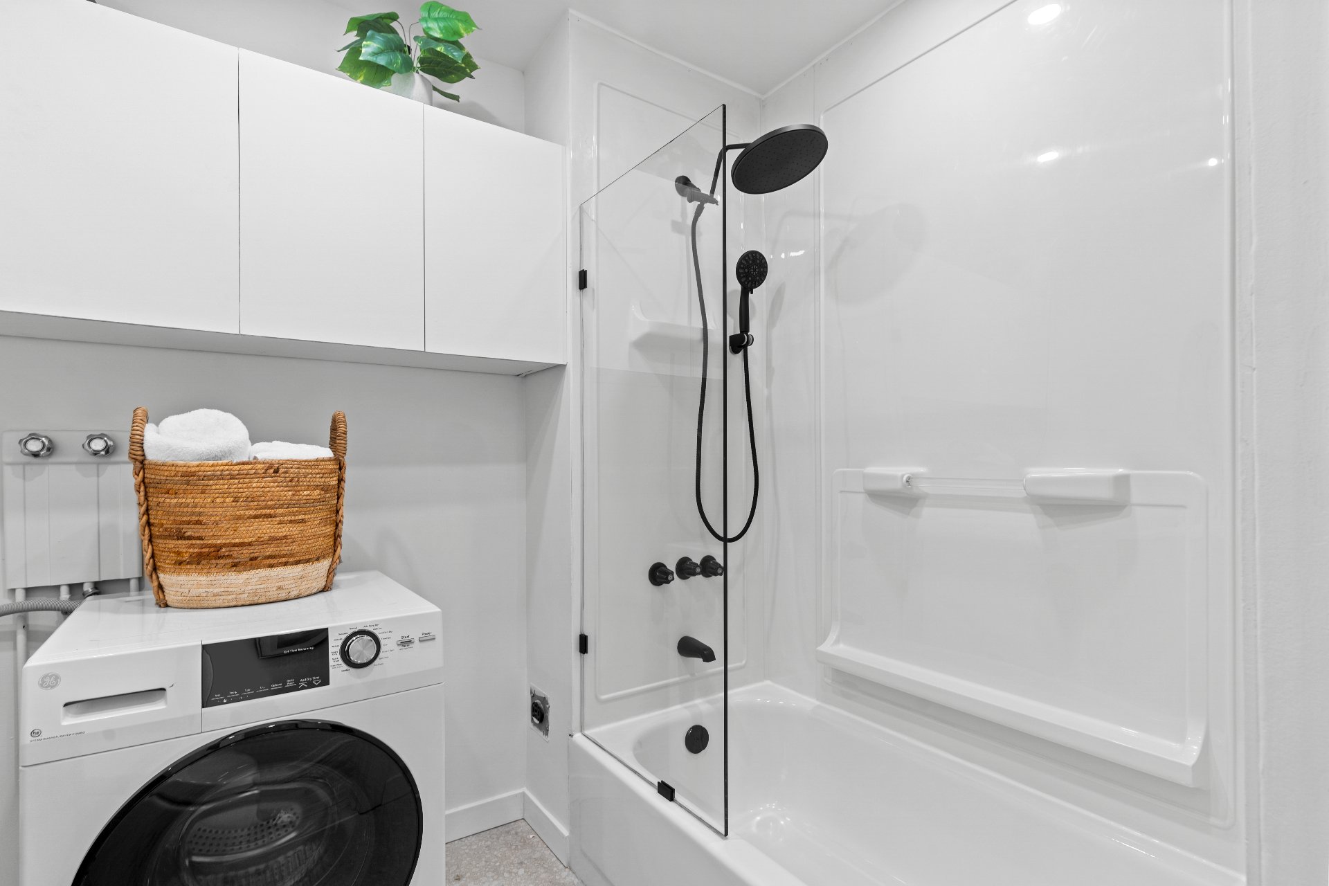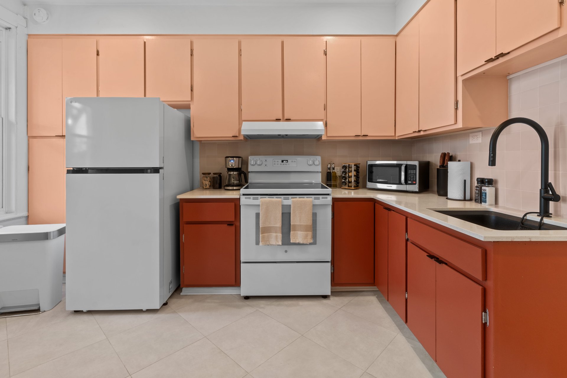 and appliances: fridge, stove, washer/dryer, A/C unit.