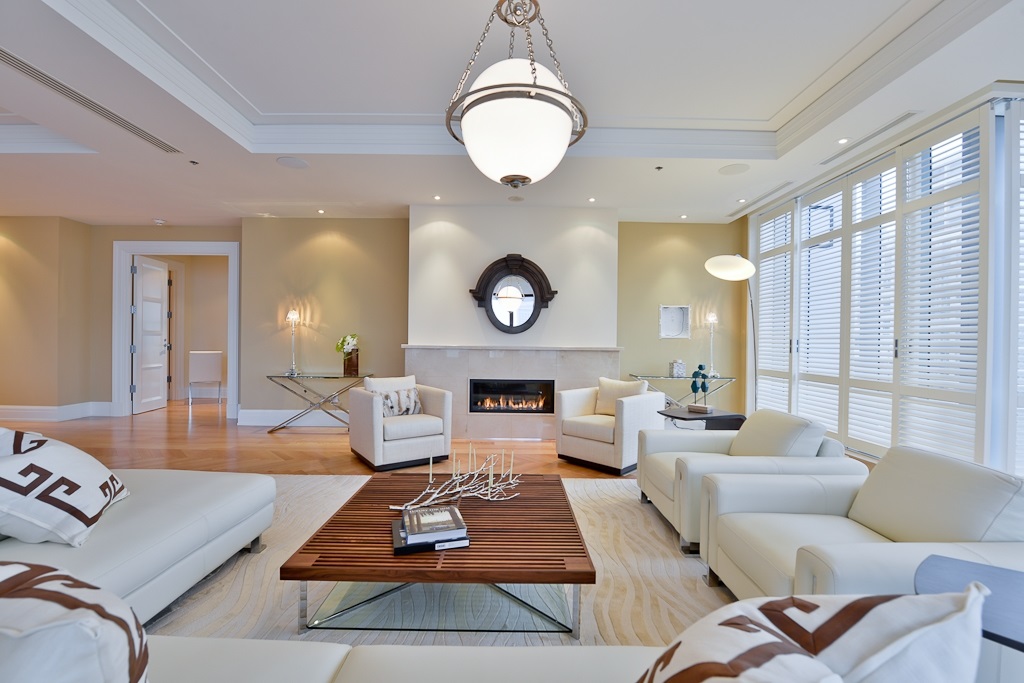 | Living room | 10th floor | 25'9" x 24'4" | Wood | Gaz Fireplace; Panoramic floor to celing windows with views & adorned with custom louvers |